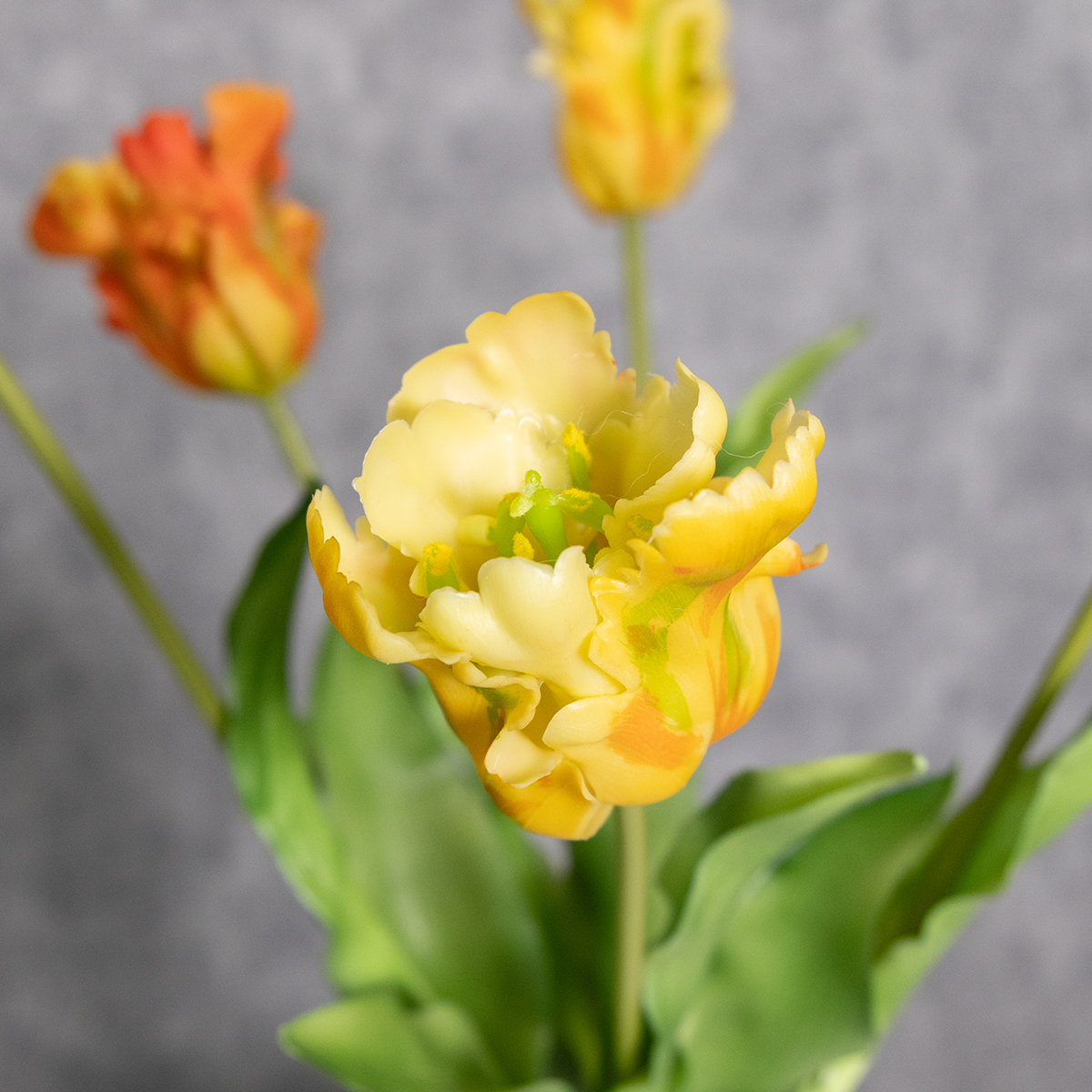Nämä tekokukat ovat todellinen katseenvangitsija ja tekevät vaikutuksen aidolla ulkonäöllään. 53 cm korkeina ja 8 cm halkaisijaltaan ne ovat täydellisen kokoisia esillepanoon yksittäin kapeassa maljakossa tai tyylikkäänä kimppuna suuressa lattiamaljakossa. Korkealaatuisen polyesterin ja muovin ansiosta kukat ja lehdet tuntuvat miellyttävän pehmeiltä ja säilyttävät eloisat värinsä. Erityisen käytännöllinen ominaisuus: ne ovat uskomattoman monipuolisia. Olipa kyseessä sitten elegantti olohuoneen koriste, kevään kausiluonteinen yksityiskohta tai juhlien kohokohta – niiden kirkas väri on todellinen tunnelman kohottaja. Yhdistä tulppaaneja helposti muihin tekokukkiin luodaksesi harmonisia kimppuja. Minimalistisen ilmeen saat asettamalla ne yksinkertaisesti korkeaan valkoiseen keraamiseen maljakkoon. Tyyli? Ajaton ja moderni! Nämä tulppaanit sulautuvat tyylikkäästi niin skandinaaviseen, moderniin kuin klassiseen sisustustyyliinkin. Vielä yksi vinkki: ne ovat käytännössä tuhoutumattomia – täydellisiä kotitalouksiin, joissa on lapsia tai lemmikkejä. Ne, jotka vaihtavat usein koristelujaan, rakastavat niiden joustavuutta: vaihda vain maljakko, kokeile uutta asetelmaa – ja uusi sisustuskonsepti on luotu.
