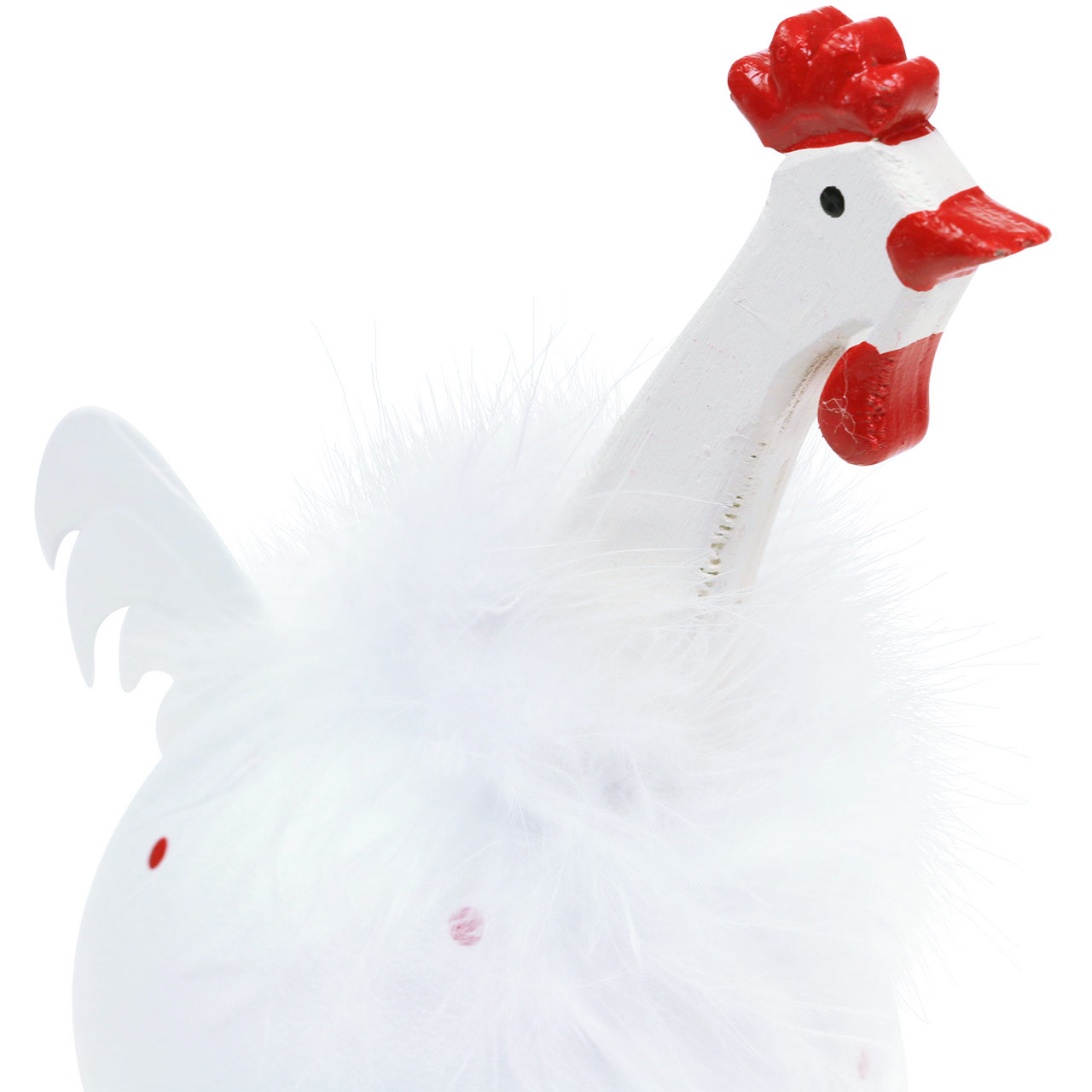 Pääsiäispupujen ja -munien lisäksi kanat ovat tietenkin myös osa onnistunutta kevätkoristelua pääsiäiskaudella! Tämän jalon VIANA-brändin kepeän kanan avulla saat erityisen viehättävän hahmon kotiin. Koristeellinen kana on valmistettu metallista ja puusta. Valkoinen perusväriä korostettiin punaisilla pisteillä rungossa ja kontrastilla kampa ja nokka rikastettu. Kohokohta on kuitenkin höyhenboa, joka kantaa kanaa kaulan ympärillä.