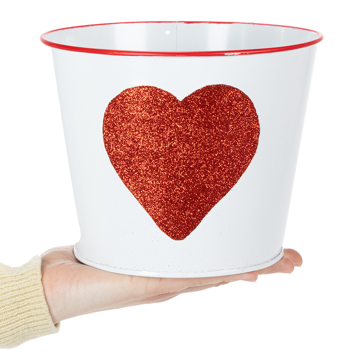 Tämä kimaltelevan sydämen muotoinen kukkaruukku on ihanteellinen kylvötarvike orkideoiden lahjaksi ystävänpäivänä. Valkoisessa peltikauhassa on erittäin romanttinen sydän punaisella glitterillä ja punaisella reunuksella keskellä. Tällaisella klassisella muotoilulla äiti iloitsee myös kasvista tai kukasta äitienpäiväksi.