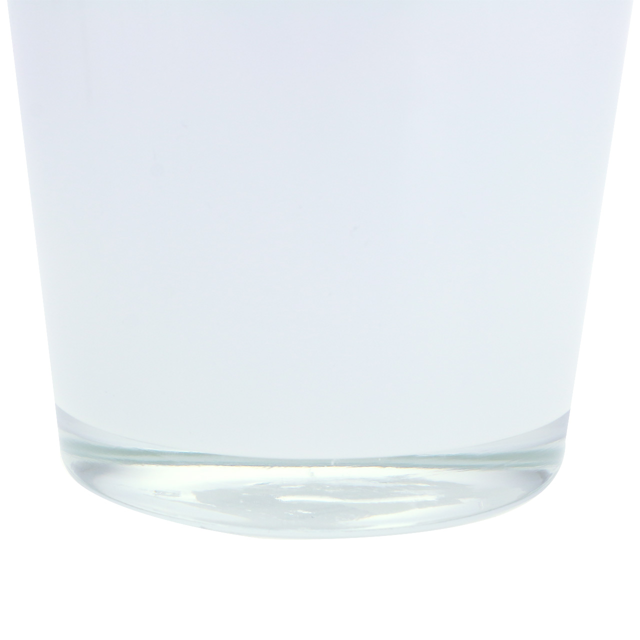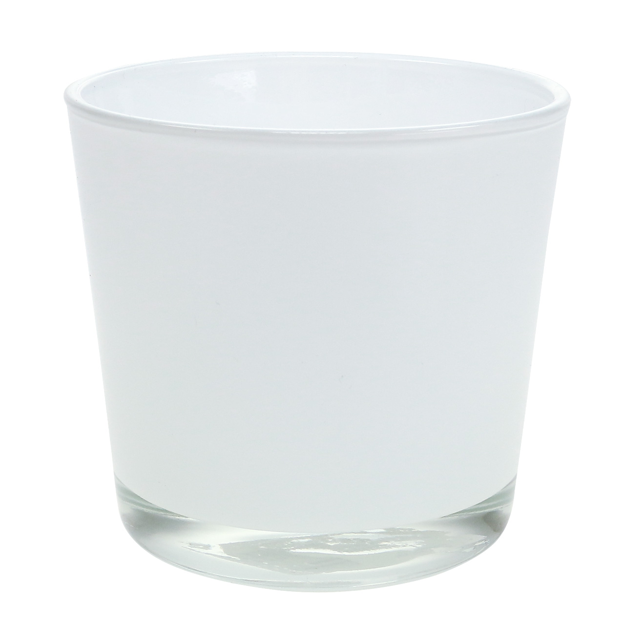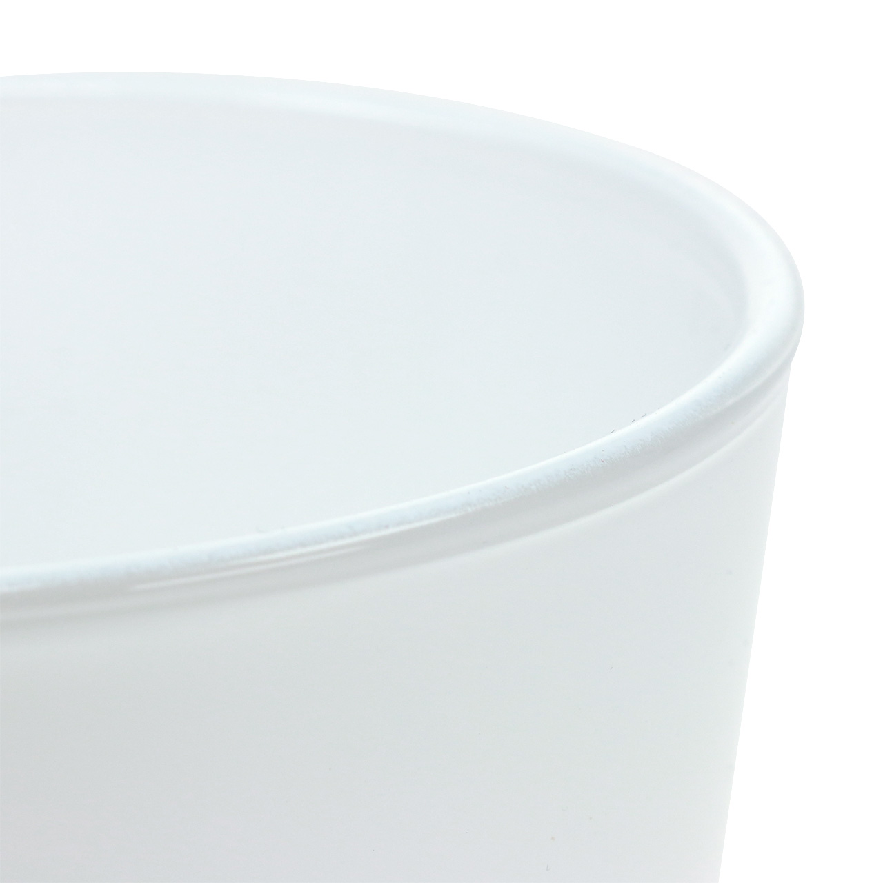 Valkoinen lasinen istutusastia on halkaisijaltaan yhteensä noin 11,5 senttimetriä, aukon halkaisija on noin 11 senttimetriä ja jalanjäljen halkaisija on noin 9,5 senttimetriä. Lasinen kukkaruukku on noin 10,7 senttimetriä korkea.