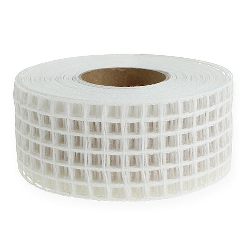 Valkoinen ristikkoteippi on kelattu rullalle ja sen pituus on noin 10 metriä ja leveys noin 4,5 senttimetriä.