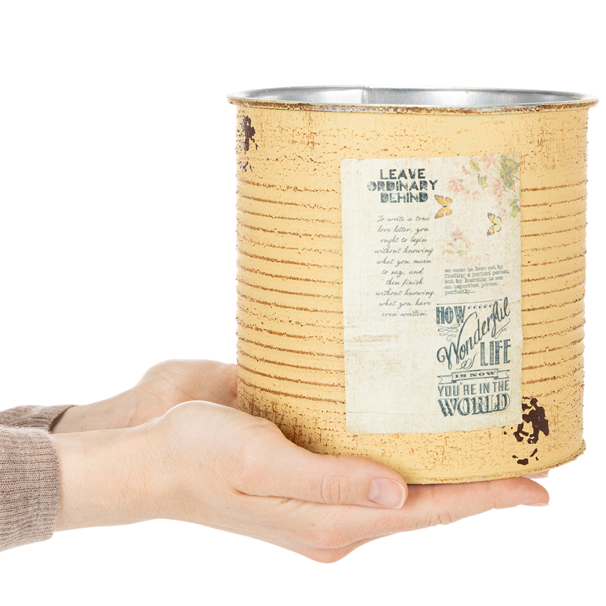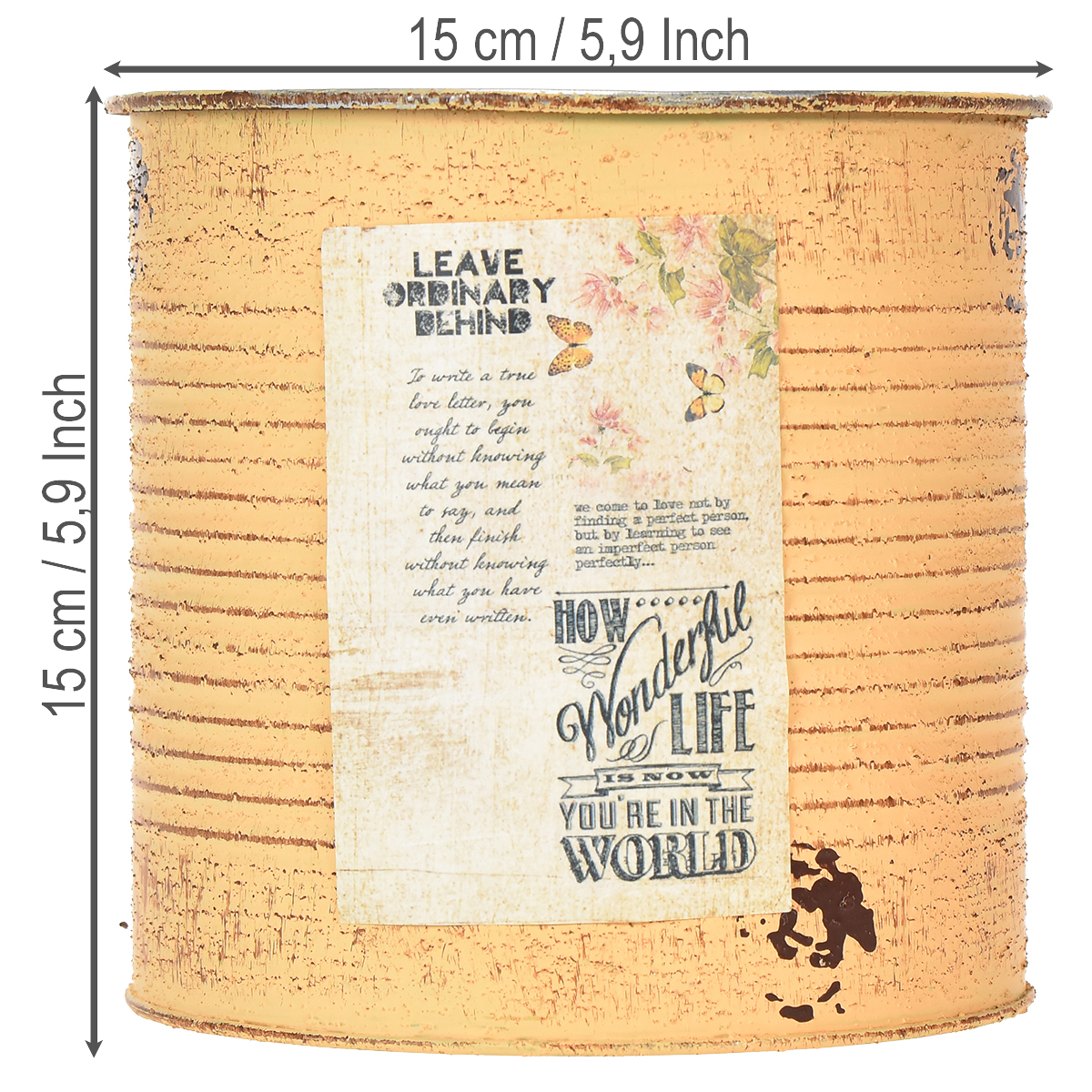 Tämä rakkaudella suunniteltu vintage-tyylinen kukkaruukku tekee mistä tahansa sisustusprojektista erityisen kohokohdan. Retrohenkisten yksityiskohtien ja maalattujen ruostekuvioiden ansiosta nämä ainutlaatuiset ruukut luovat viihtyisän tunnelman – täydelliset maalaistyyliin tai rustiikkiseen ympäristöön. Yhdistelmämahdollisuudet ovat käytännössä rajattomat – olipa kyseessä sitten koristeellinen ruukku huonekasveille, foliolla vuorattu ruukku, tee-se-itse-maljakko kuivakukille tai järjestelijä kynille ja pienille asusteille. Jokainen purkki on 15 senttimetriä korkea ja todellinen monilahjakkuus.