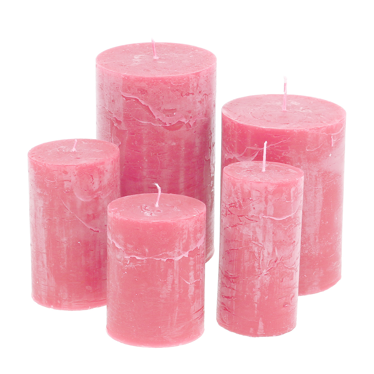 Pinkinväriset yksiväriset pilarikynttilät, jotka voit valita eri kokoisina oikeanpuoleisen välilehden kautta, toimitetaan erimittaisina sarjoina pahvipakkauksessa. Huomioi avotulen käsittelyä koskevat turvallisuusmääräykset polttaessasi.